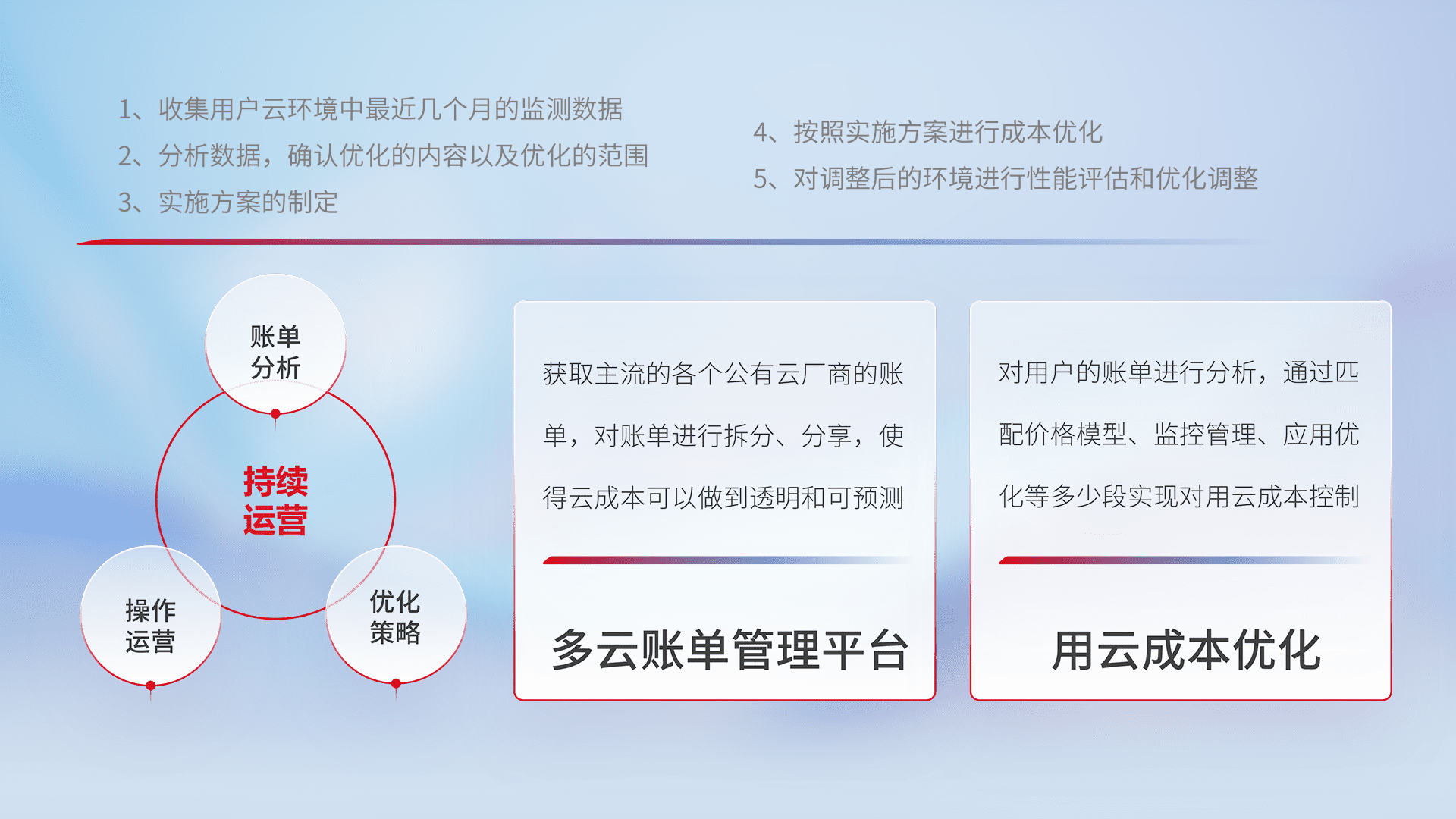 通过多云纳管,,,以统一的资源数据模型把客户的云资源进行抽象和封装,,,进而实现对多云资源的统一操作,,,保障云资源管理的可靠性、、、稳定性与可用性。。。量身定制化运维内容,,配置、、、、开发运维、、补丁管理、、、备份、、、监控、、、认证和访问管理、、、、审计和日常巡检等,,,,保障在用云过程中的可靠度,,,稳定度以及高可用率。。。。